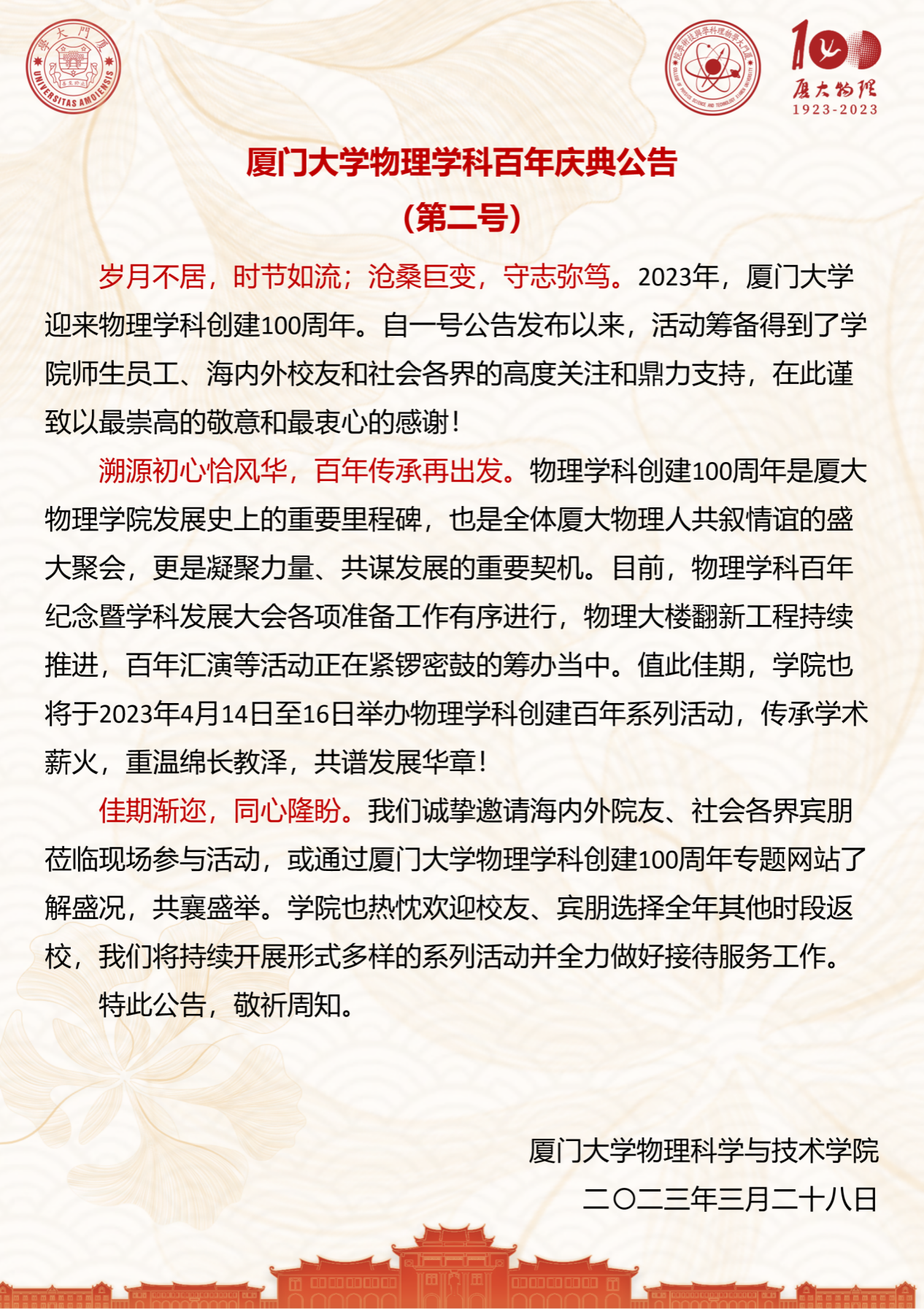 岁月不居,时节如流;沧桑巨变,守志弥笃。2023年,厦门大学迎来物理学科创建100周年。自一号公告发布以来,活动筹备得到了学院师生员工、海内外校友和社会各界的高度关注和鼎力支持,在此谨致以最崇高的敬意和最衷心的感谢!
