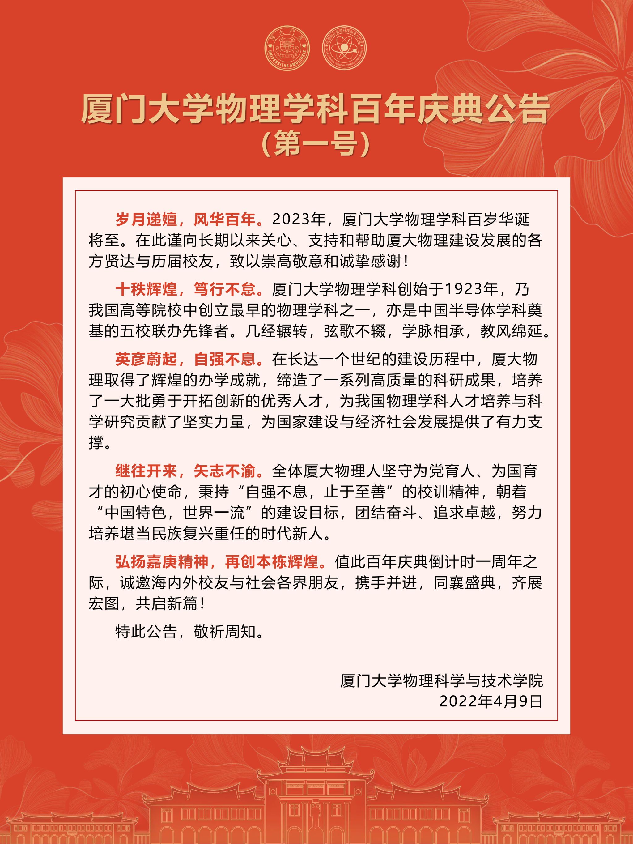 岁月递嬗,风华百年。2023年,厦门大学物理学科百岁华诞将至。在此谨向长期以来关心、支持和帮助厦大物理建设发展的各方贤达与历届校友,致以崇高敬意和诚挚感谢!