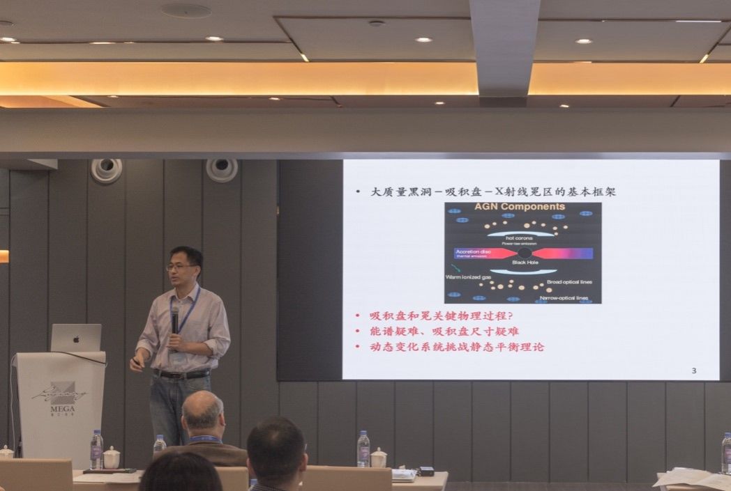 随后,三十余位专家学者做了会议报告,内容涉及活动星系核不同空间尺度、时间尺度和能段范围的光变观测与理论研究,引起了与会人员的热烈讨论与积极交流。会议总结环节由中国科学技术大学王挺贵教授主持,邀请各单位代表就活动星系核多波段光变研究的未来观测设备、学术合作等议题展开讨论。会议邀请高能物理研究所王建民研究员做大会总结报告,展望未来活动星系核研究的前沿、重点与热点问题。