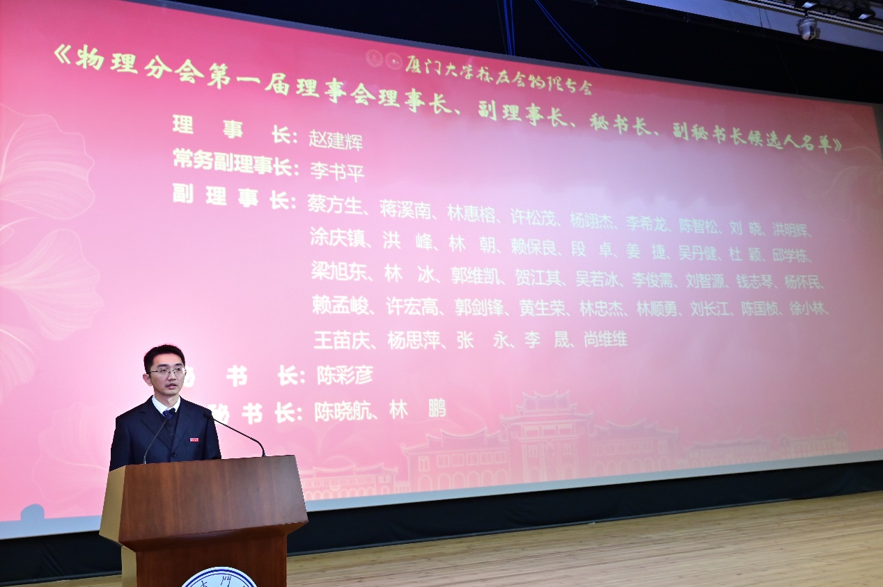 大会审议并通过了《厦门大学校友会物理分会章程(草案)》及首届理事会理事长、副理事长、秘书长、副秘书长、理事、顾问等人员名单。由赵建辉担任首任理事长,吴伯僖担任名誉理事长,陈彩彦担任秘书长,此外还包括42位副理事长、42位理事、2位副秘书长、7位秘书和15位顾问。