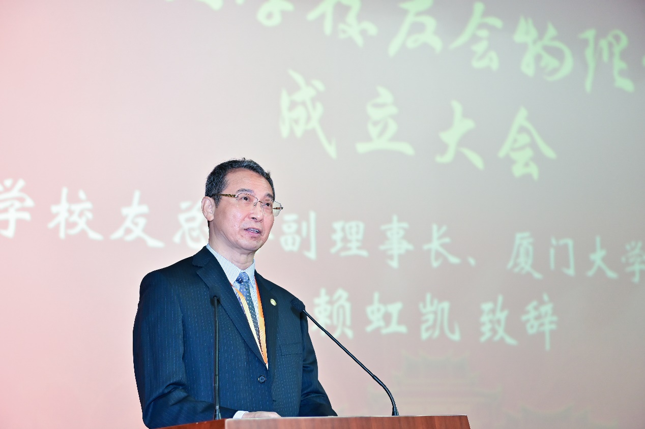 赖虹凯代表厦门大学及校友总会致辞,向厦门大学校友会物理分会的成立表示祝贺,向长期以来关心、支持学校发展以及为在各行各业为母校赢得荣誉、作贡献的校友致以由衷的感谢。他表示,如今厦大“在世界一流大学里有自己的一席之地”的目标正在一步步变成现实,新的一百年已经拉开序幕。物理分会作为厦大校友总会的隶属分会,让厦大物理人有了一个新的家。他提出了四点希望:首届理事会积极发挥职责;物理分会发挥桥梁纽带作用;物理校友自强不息、砥砺奋进;广大校友爱校荣校、携手共进。