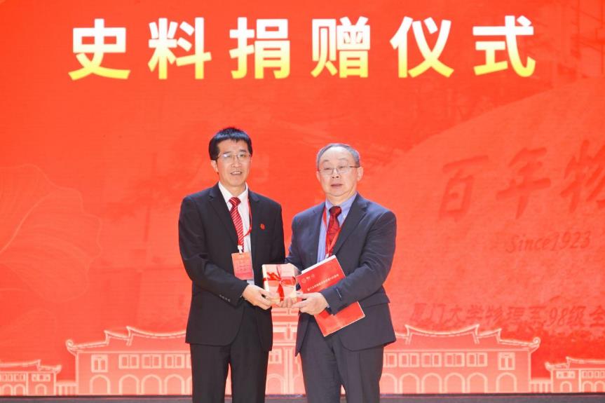 谢希德之子曹惟正向厦门大学物理科学与技术学院捐献厦大物理名师谢玉铭与“中国半导体之母”谢希德的史料相关书籍,通过三代人的传递,展示厦大物理自强不息和求真钻研的精神。
