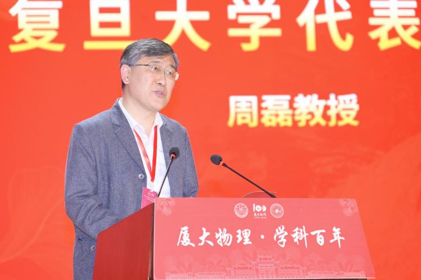 复旦大学物理系主任周磊教授致辞,他回顾了厦大物理校友谢希德院士在复旦大学担任校长之时为复旦乃至中国的半导体事业发展做出的巨大贡献,他希望厦门大学物理学科能够为国家源源不断地输送科研人才,在基础学科和高等人才教育中取得更好的成绩。