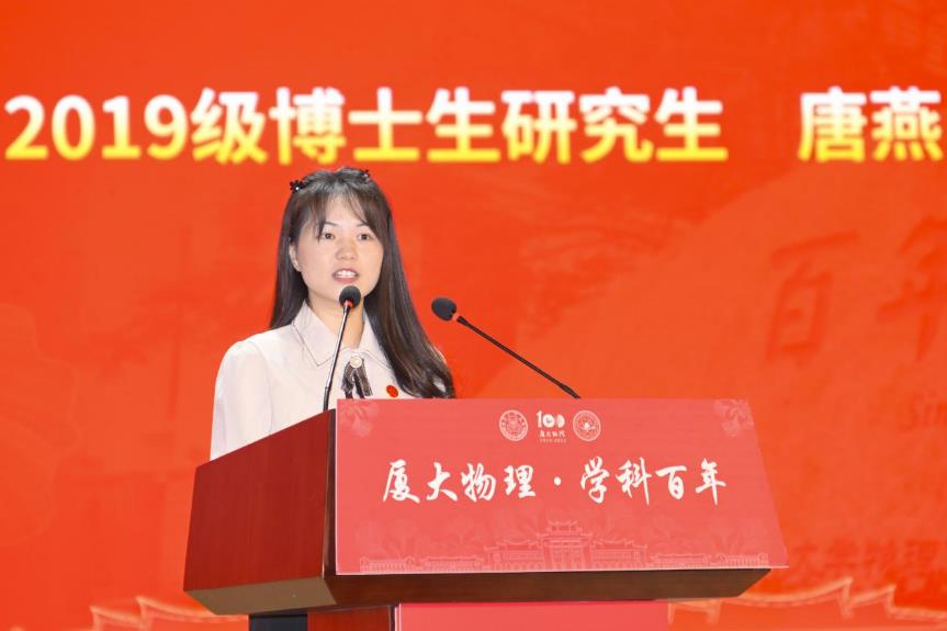 2019级博士生唐燕作为学生代表发言。她发表了在学院学习的感想,分享了在厦大物理求学的科研生活,希望将青春小我融入国家大我,将专业所学应用到国家的发展。