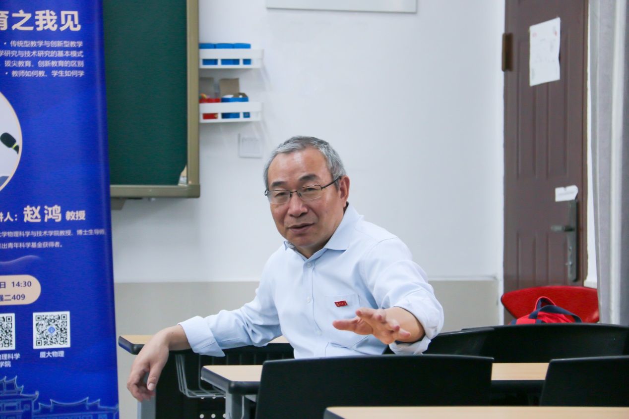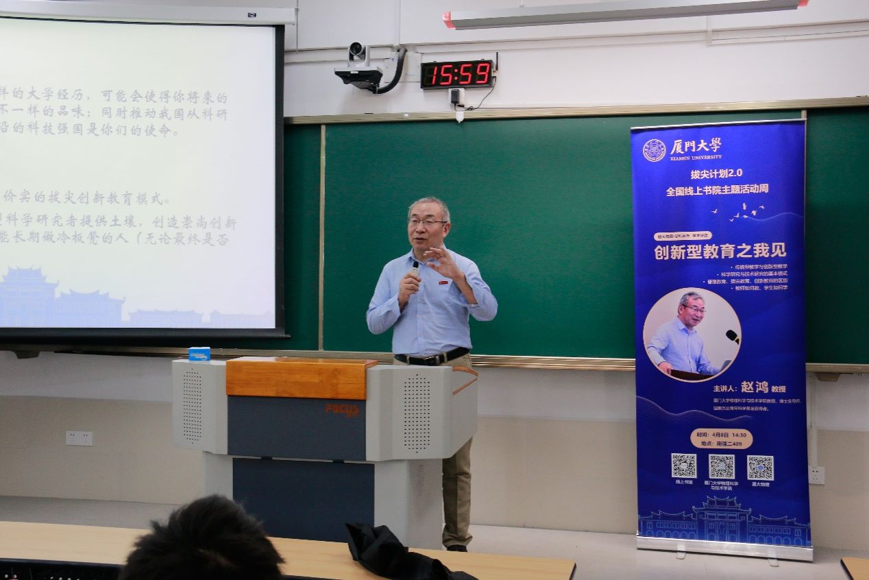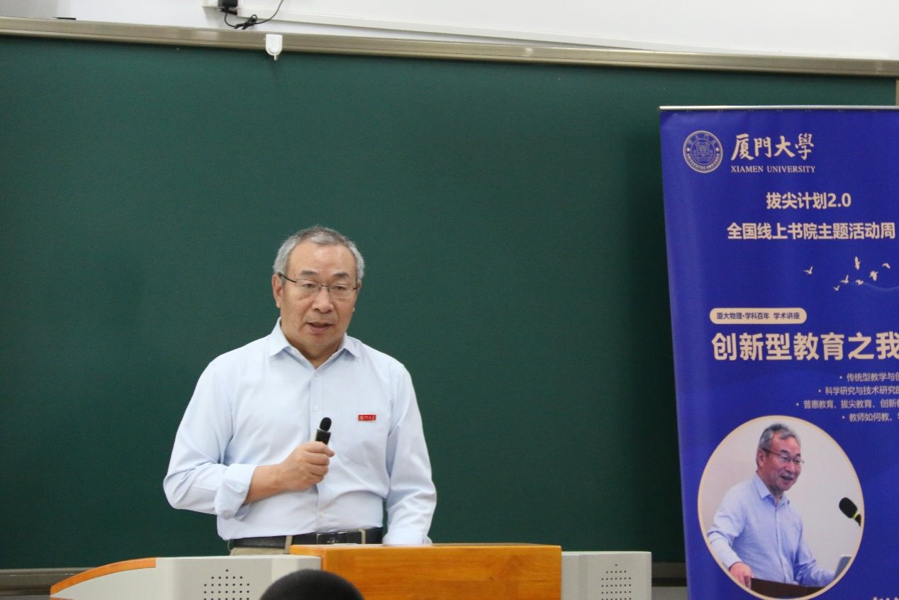 夯实基础学科培养,打造拔尖创新英才。今年4月,拔尖计划2.0全国线上书院主题活动周在厦门大学开启。物理科学与技术学院赵鸿教授以《创新型教育之我见》为主题,带来了一场生动有趣的名家讲坛。活动以线上线下相结合的方式进行,于4月21日在线上书院开展公开课,物理科学与技术学院全体强基计划、拔尖计划本科生、部分优秀研究生及部分教师则在厦门大学南强二教学楼现场聆听与互动。